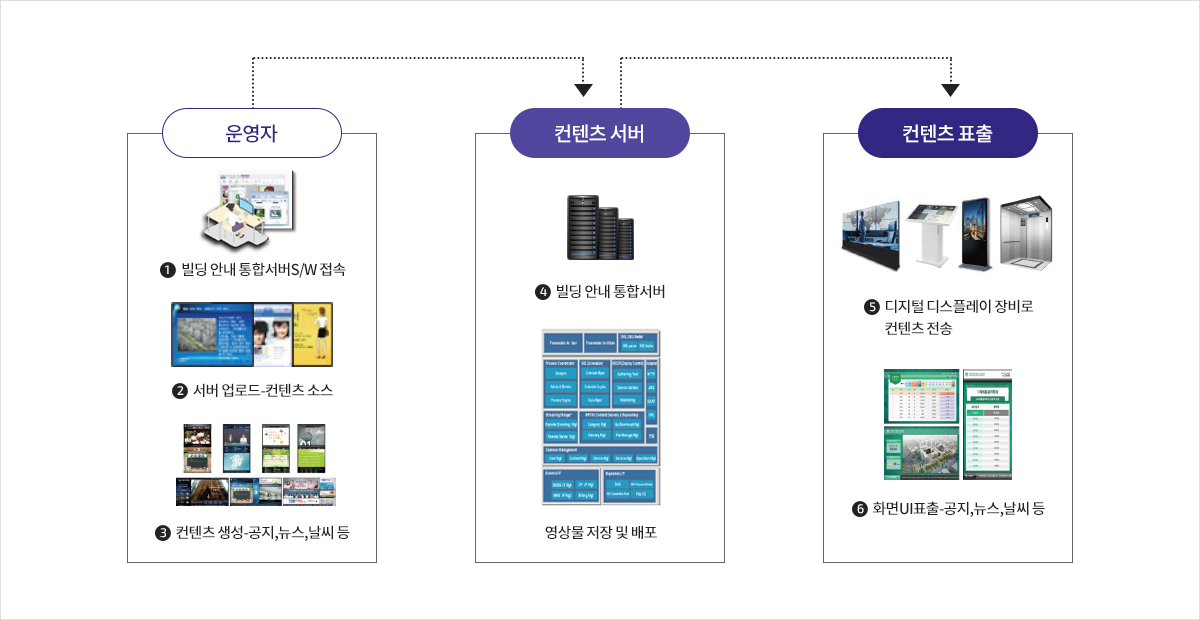디스플레이 장비를 통해 고품질의 다양한 디지털 컨텐츠 (동영상, 이미지, 텍스트) 를 자유롭게 화면에 구성하고 배포하여 이용객에게 시각적인 컨텐츠를 제공하는 솔루션 입니다.